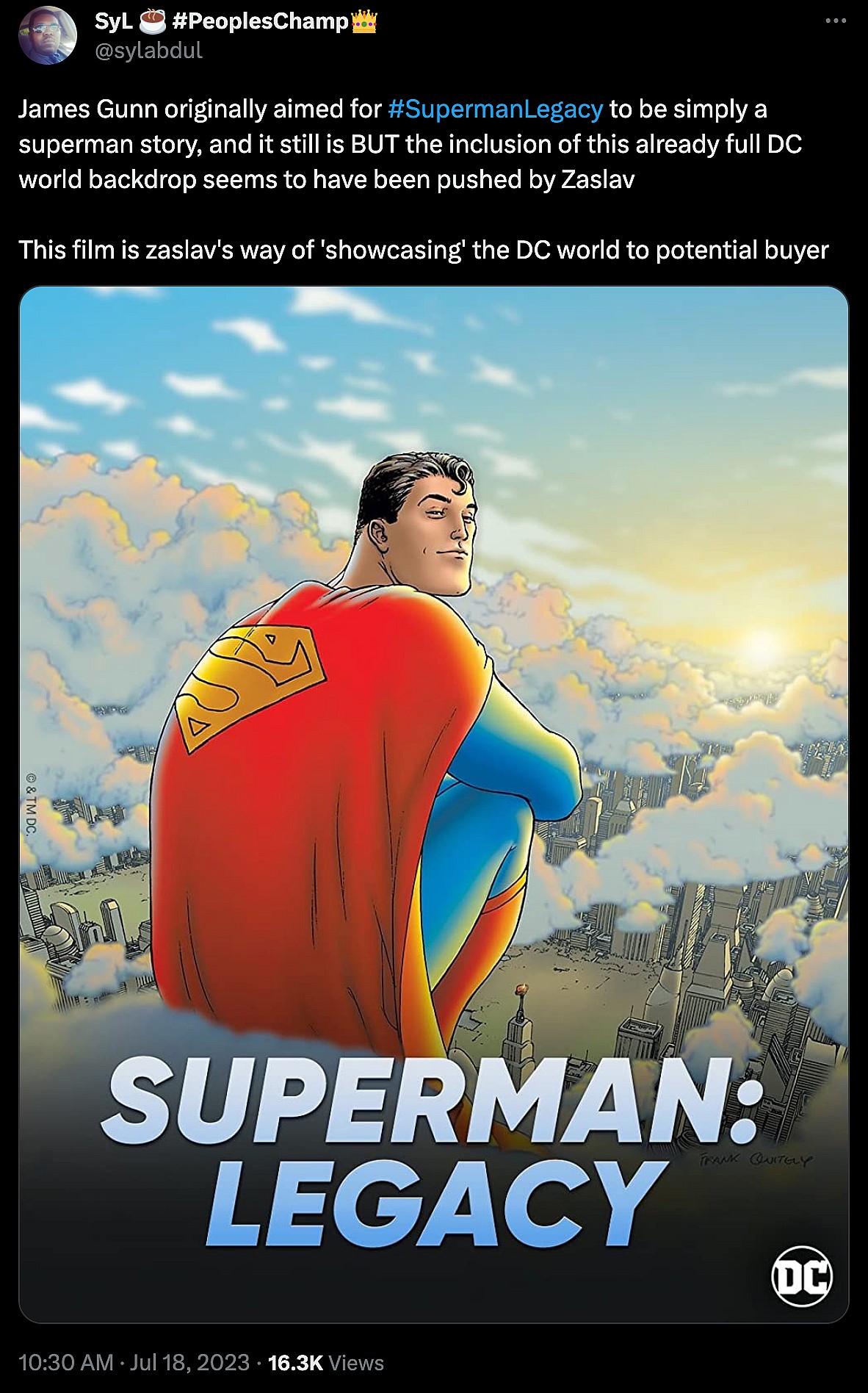YouTuber Syl Abdul hears that Warner Bros. Discovery CEO and Gunn’s boss David Zaslav is pushing for all the extra heroes and accouterments with an agenda in mind. “James Gunn originally aimed for [Superman: Legacy] to be simply a superman story, and it still is BUT the inclusion of this already full DC world backdrop seems to have been pushed by Zaslav,” Abdul tweeted.