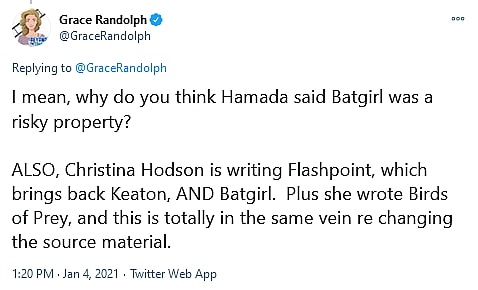 “Christina Hodson is writing Flashpoint, which brings back Keaton, AND Batgirl,” wrote Randolph. “Plus she wrote Birds of Prey, and this is totally in the same vein re changing the source material.”