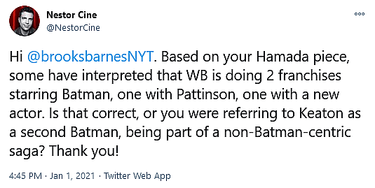 They showed how Brooks Barnes, writer of the New York Times piece on Walter Hamada that started all this, cleared up comments he made about Keaton playing Batman.