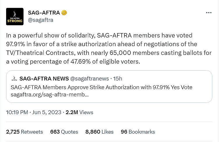 SAG-AFTRA went on to detail what the strike authorization means noting that it “empowers the union’s National Board to initiate a strike if the AMPTP won’t reach a fair deal with the union. The current SAG-AFTRA TV/Theatrical Contracts expire at midnight on June 30, 2023.”