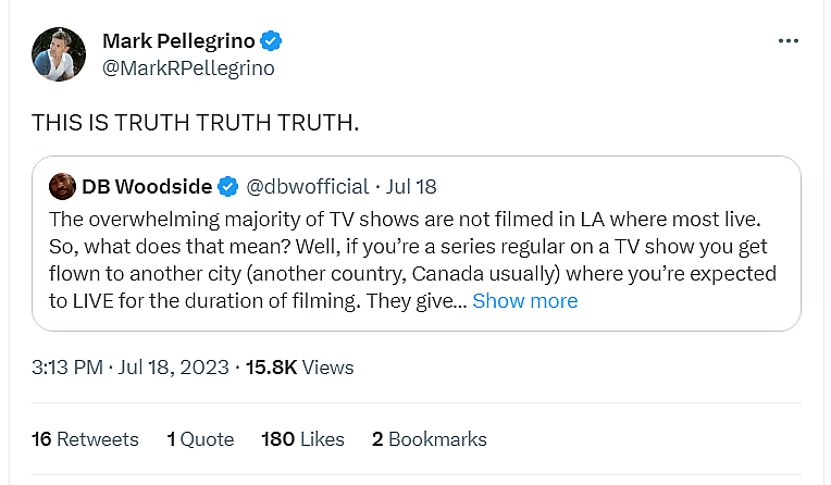 Woodside then relayed, “Add airline tickets to fly back and forth to see your partners and children. We pay for that shit too. This happens EVERY SINGLE SEASON on TV shows throughout the USA that film outside of LA.”
