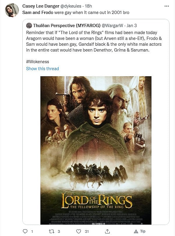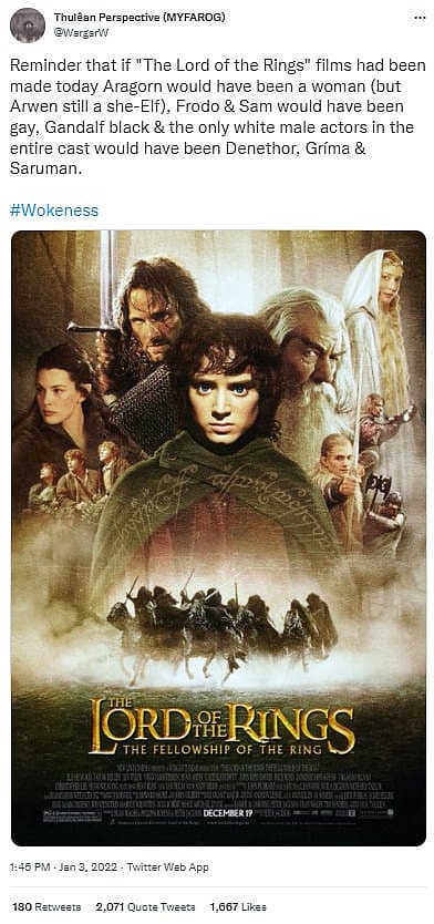 The latest effort to spread these lies comes after Twitter user WargarW theorized that if Hollywood was making The Lord of the Rings today “Aragorn would have been a woman (but Arwen still a she-Elf), Frodo & Sam would have been gay, Gandalf black & the only white male actors in the entire cast would have been Denethor, Gríma & Saruman. #Wokeness.”