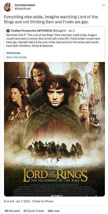 Another tweeted, “Sam and Frodo were gay when it came out in 2001 bro.”