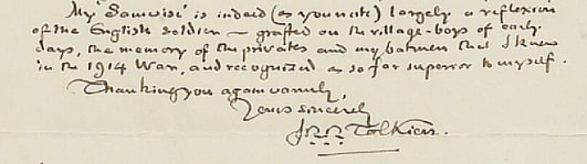 Tolkien would echo these comments in a letter written to H. Cotton Minchin dated April 16, 1956. That letter states, “My ‘Samwise’ is indeed (as you note) largely a reflexion of the English soldier—grafted on the village-boys of early days, the memory of the privates and my batmen that I knew in the 1914 War, and recognized as so far superior to myself.”
