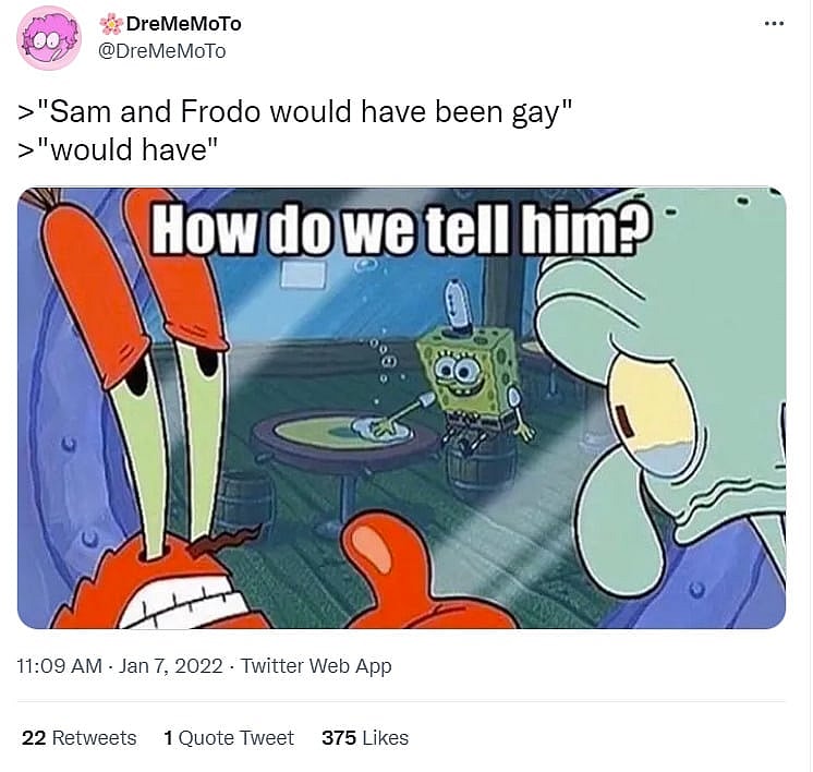 In response, the cultural vandals came out of the woodwork. One wrote, “>Sam and Frodo would have been gay” >”would have.” They then shared a Spongebob meme asking, “How do we tell him?”