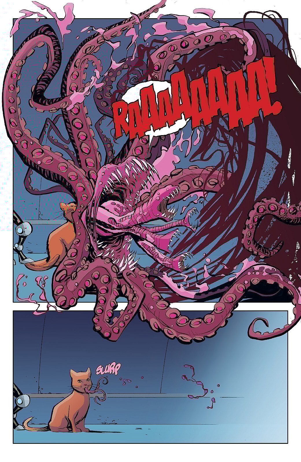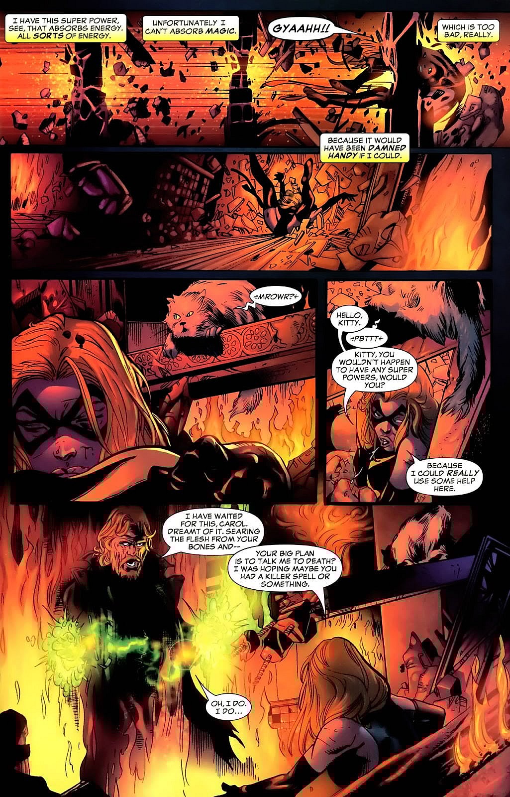 Carol Danvers was getting her butt kicked when she used the cat as a distraction to escape from Travelers’ devastating magic attacks.