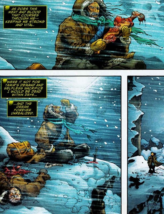 At the same time, he is on a quest to resurrect Isis, his wife, that takes him and a companion across a freezingly intemperate mountain range. This is the point where he kills and consumes his willing follower.