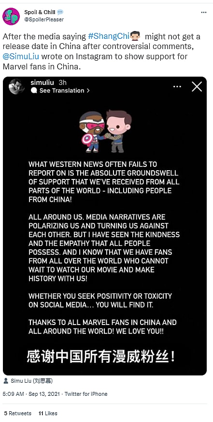 Simu Liu has responded to these reports that the film might not get a release in China via an Instagram Story post.