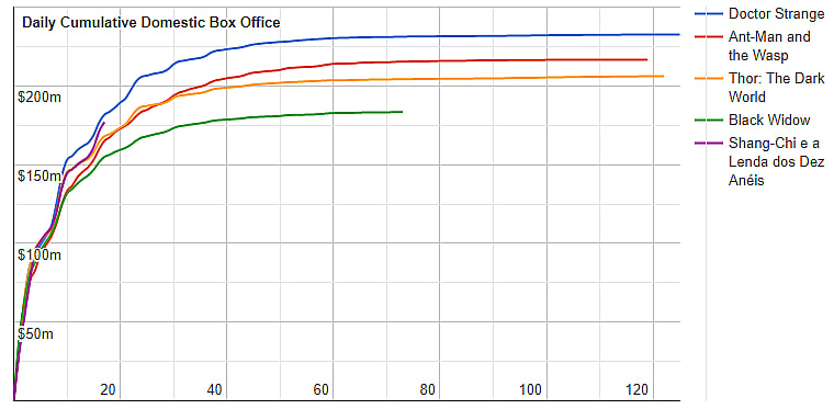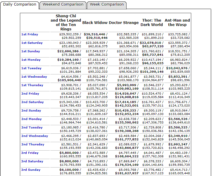 Looking at the chart below, you can see that Shang-Chi bested Black Widow, Doctor Strange, Thor: The Dark World, and Ant-Man and the Wasp in its third weekend. However, it had lower grosses than Ant-Man and the Wasp, Black Widow, and Doctor Strange during the week.