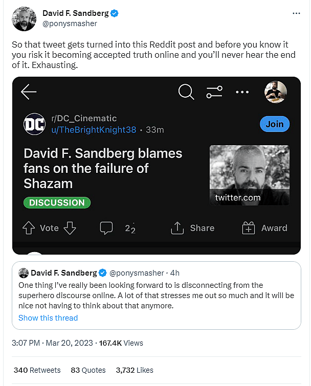 To elucidate his point he pointed to a Reddit thread discussing his tweets with a headline reading, “David F. Sandberg blames fans on the failure of Shazam.”