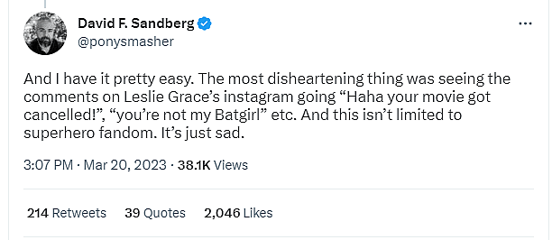 He added, “And I have it pretty easy. The most disheartening thing was seeing the comments on Leslie Grace’s instagram going ‘Haha your movie got cancelled!’, ‘you’re not my Batgirl’ etc.”