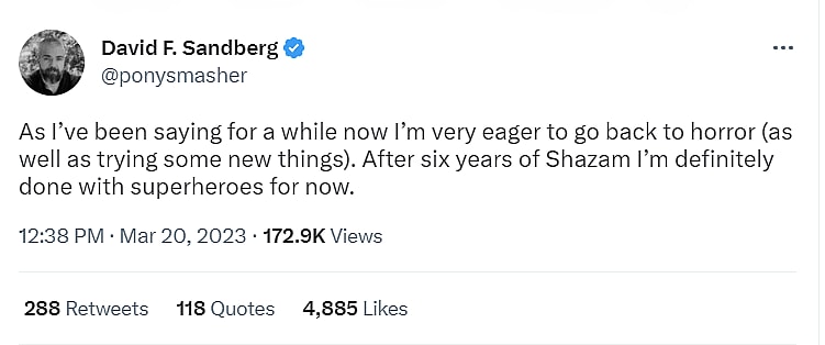 He then indicated he would not be making any superhero films for the foreseeable future, “As I’ve been saying for a while now I’m very eager to go back to horror (as well as trying some new things). After six years of Shazam I’m definitely done with superheroes for now.”