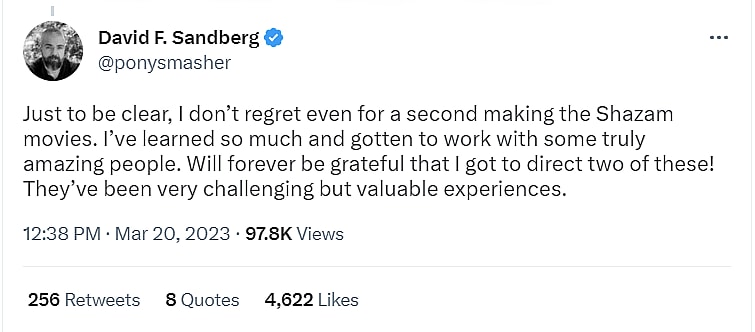 Sandberg then clarified, “Just to be clear, I don’t regret even for a second making the Shazam movies. I’ve learned so much and gotten to work with some truly amazing people. Will forever be grateful that I got to direct two of these! They’ve been very challenging but valuable experiences.”