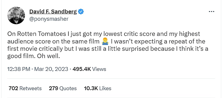 In a Twitter thread, Sandberg began writing, “On Rotten Tomatoes I just got my lowest critic score and my highest audience score on the same film. I wasn’t expecting a repeat of the first movie critically but I was still a little surprised because I think it’s a good film. Oh well.”