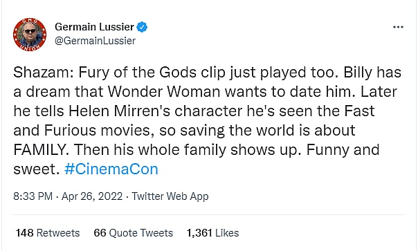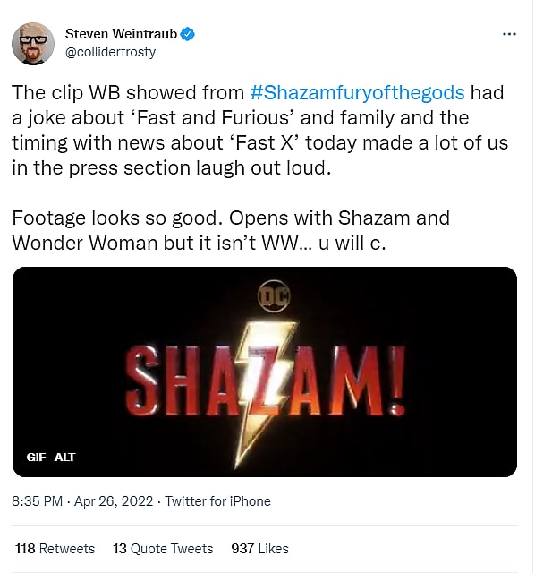 “The clip WB showed from #Shazamfuryofthegods had a joke about ‘Fast and Furious’ and family and the timing with news about ‘Fast X’ today made a lot of us in the press section laugh out loud,” he tweeted.
