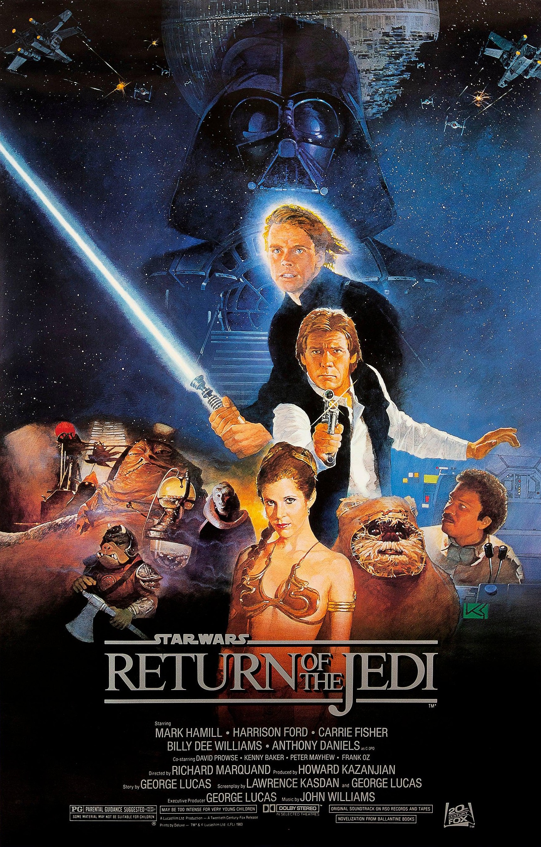 Known as the film’s ‘Style ‘B’’ poster, the illustration originally produced by Japanese artist Kazuhiko Sano features Princess Leia, clad in the attire forced upon her during her time as Jabba’s captive, standing front and center amidst Return of the Jedi’s principal cast.