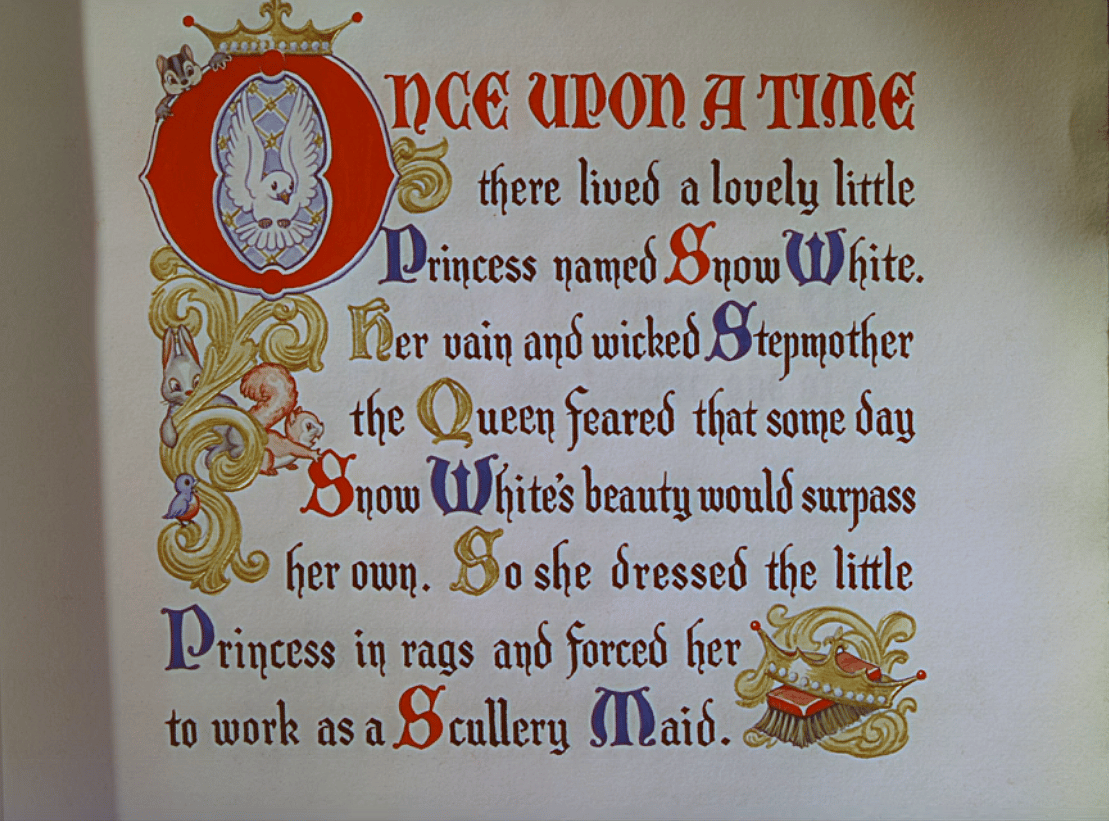 The film opens up with images from a story book that read, “Once upon a time there lived a lovely little princess named Snow White. Her vain and wicked stepmother the queen feared that some day Snow White’s beauty would surpass her own. So she dressed the little princess in rags and forced her to work as a scullery maid.”