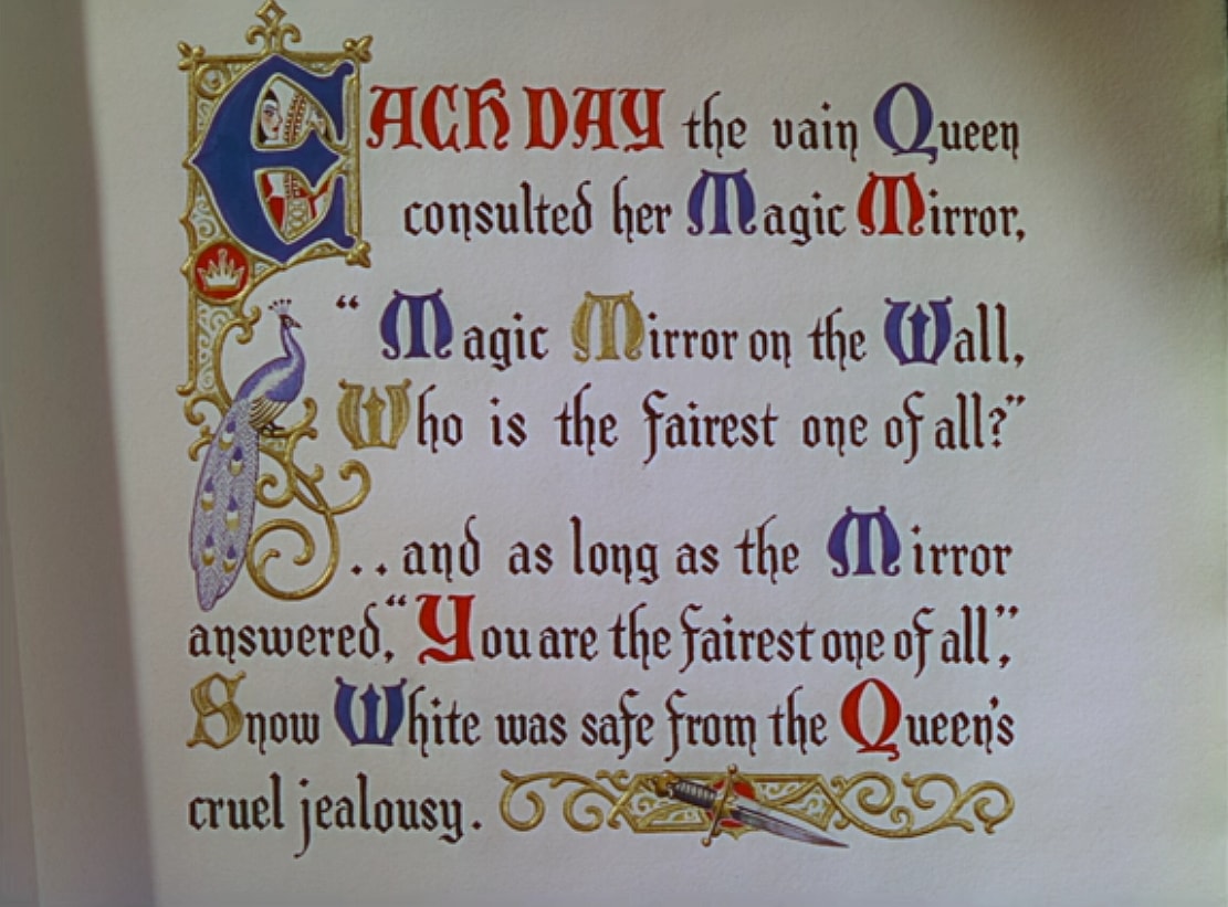 The opening continued, “Each day the vain queen consulted her magic mirror. ‘Magic Mirror on the wall who is the fairest one of all?’ ..and as long as the Mirror answered, ‘You are the fairest one of all,’ Snow White was safe from the queen’s cruel jealousy.”