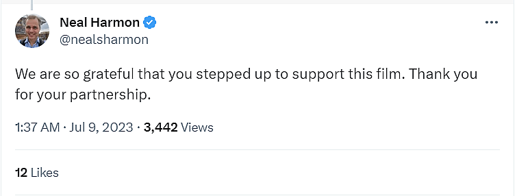 Angel Studios CEO Neal Harmon also responded to Aron’s first tweet writing, “We are so grateful that you stepped up to support this film. Thank you for your partnership.”