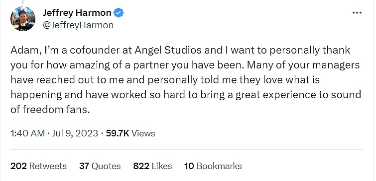 Angel Studios co-founder Jeffrey Harmon responded to Aron’s original tweet writing, “Adam, I’m a cofounder at Angel Studios and I want to personally thank you for how amazing of a partner you have been. Many of your managers have reached out to me and personally told me they love what is happening and have worked so hard to bring a great experience to sound of freedom fans.”
