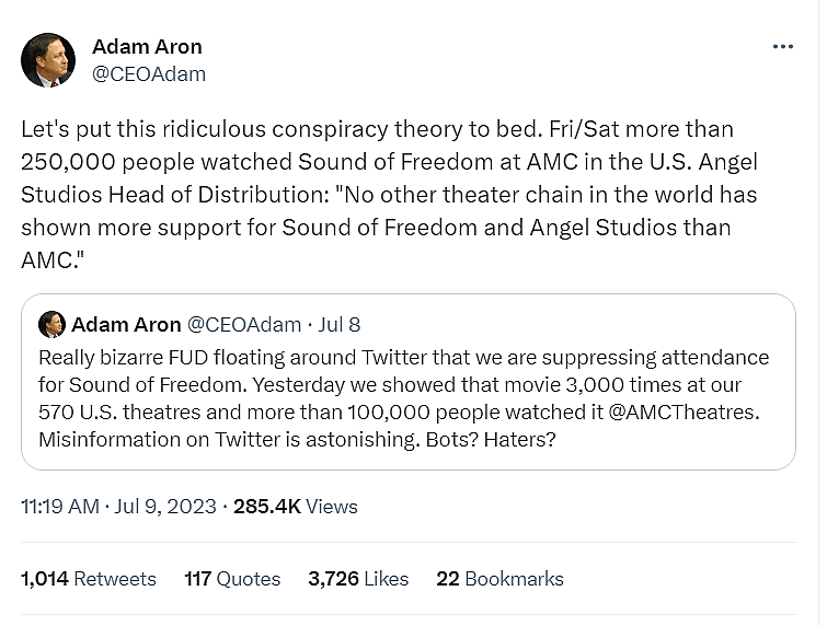 In a follow-up tweet he also wrote, “Let’s put this ridiculous conspiracy theory to bed. Fri/Sat more than 250,000 people watched Sound of Freedom at AMC in the U.S.”