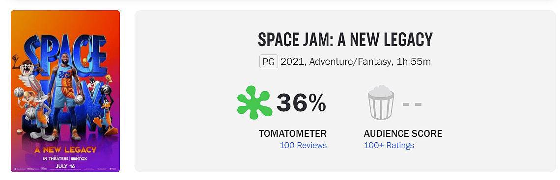 Alonso Duralde at TheWrap gives the movie a 25. He writes, “Viewers who, for whatever reason, love the first “Space Jam” may well find themselves delighted all over again, but as a once-in-a-lifetime opportunity to plunge a beloved sports figure into a century’s worth of pop culture iconography, “A New Legacy” is a big fat airball.”