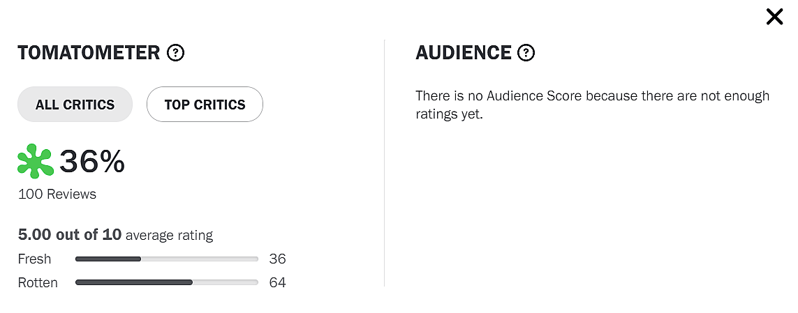 On Rotten Tomatoes, the Tomatometer currently sits at 36% from 100 reviews.