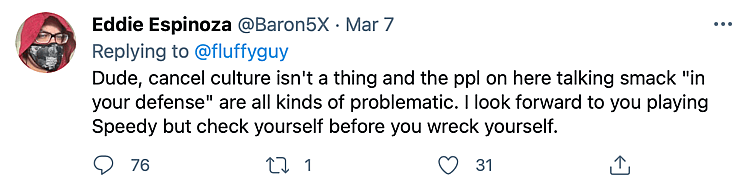Take user Baron5X, for example, who passively aggressively replied to Iglesias, “Dude, cancel culture isn’t a thing and the ppl on here talking smack ‘in your defense’ are all kinds of problematic. I look forward to you playing Speedy but check yourself before you wreck yourself.”