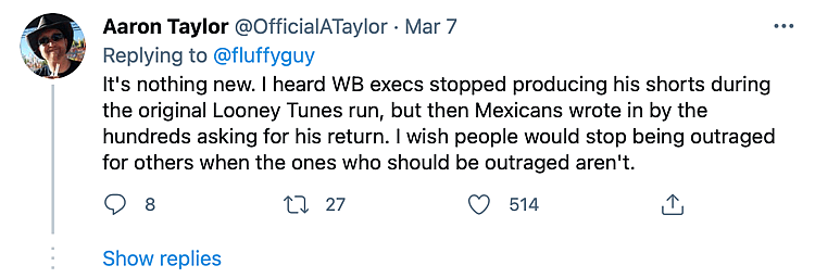 @OfficialATaylor mentioned how Warner Bros. executives “stopped producing his[Speedy Gonzales] shorts during the original Looney Tunes run, but then Mexicans wrote in by hundreds asking for his return.”