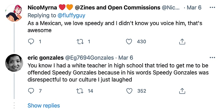 “As a Mexican, we love speedy and I didn’t know you voice him, that’s awesome,” wrote @NicoMyrna_. In response, @Eg7694Gonzales recalled, “You know I had a white teacher in high school that tried to get me to be offended Speedy Gonzales because in his words Speedy Gonzales was disrespectful to our culture I just laughed.”