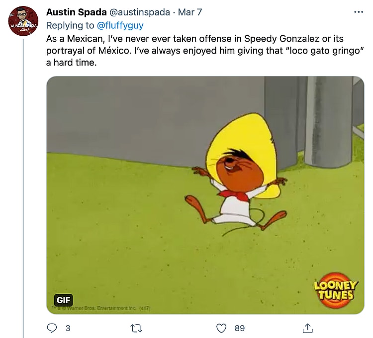 @Austinspada asserted, “As a Mexican, I’ve never ever taken offense in Speedy Gonzalez or its portrayal of México. I’ve always enjoyed him giving that ‘loco gato gringo’ a hard time.”