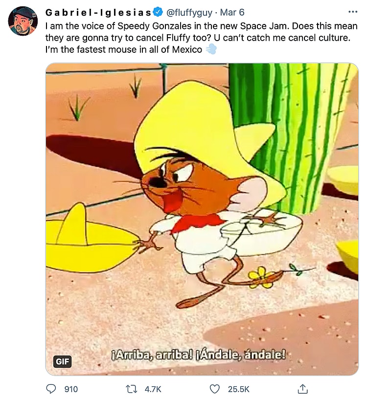On Iglesias’ official Twitter account he stated that “I am the voice of Speedy Gonzales in the new Space Jam. Does this mean they are gonna try to cancel Fluffy too?” He then went on to mock the cancel culture mob by simply telling them,”U can’t catch me cancel culture. I’m the fastest mouse in all of Mexico.”