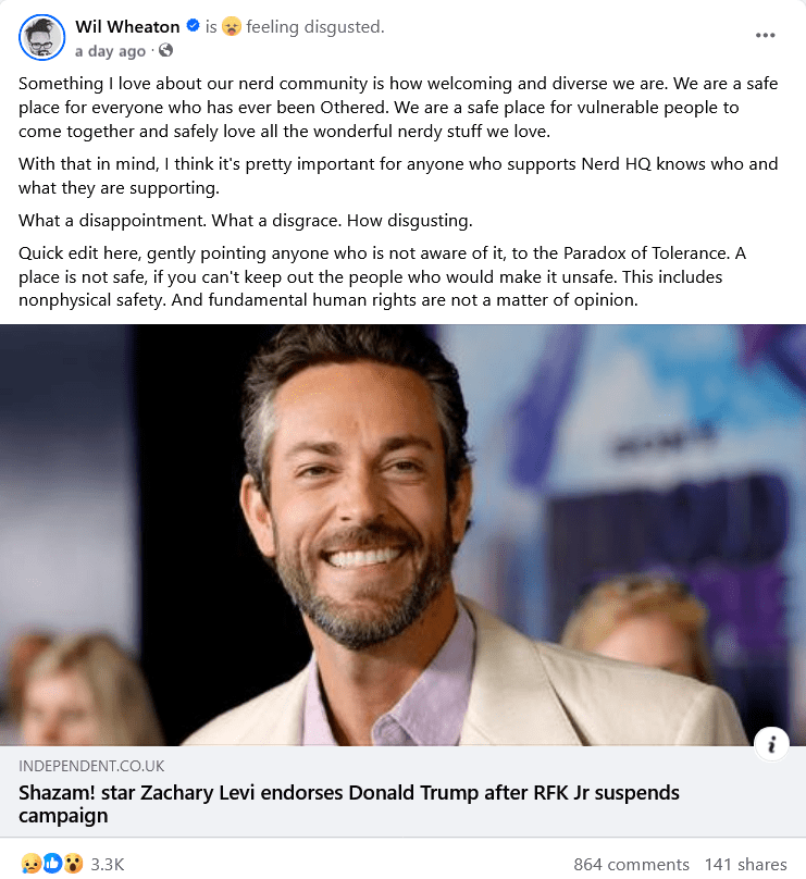 Returning to the post a few hours later, Wheaton would edit his initial words to add, “gently pointing anyone who is not aware of it, to the Paradox of Tolerance. A place is not safe, if you can’t keep out the people who would make it unsafe. This includes non-physical safety. And fundamental human rights are not a matter of opinion.”