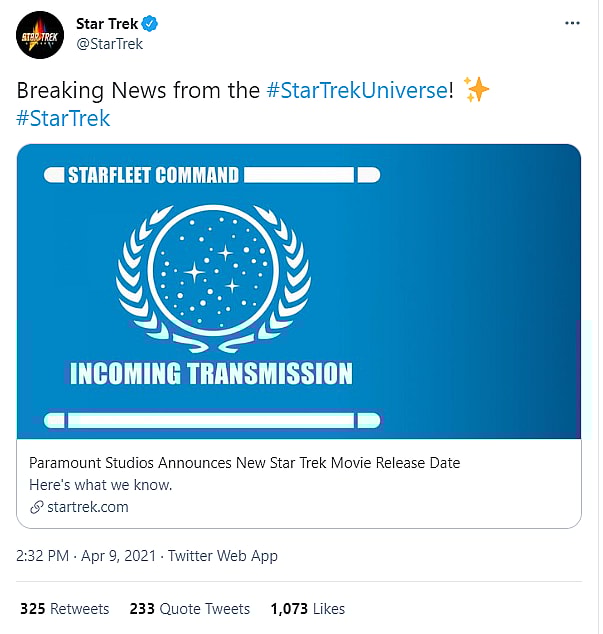 In a post to the official StarTrek.com website, the company announced, “Today, Paramount Studios announced that they will be releasing an untitled Star Trek Universe movie on June 9, 2023.”
