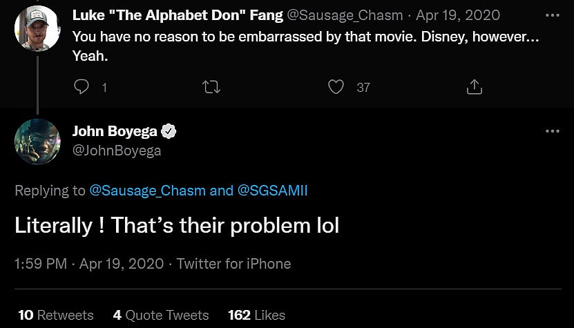 Things got worse from there. Only a few months later, Boyega sent a scathing rebuke to Disney during an interview with GQ, where we said “…you guys knew what to do with Daisy Ridley, you knew what to do with Adam Driver. You knew what to do with these other people, but when it came to Kelly Marie Tran, when it came to John Boyega, you know f*** all. So what do you want me to say?”