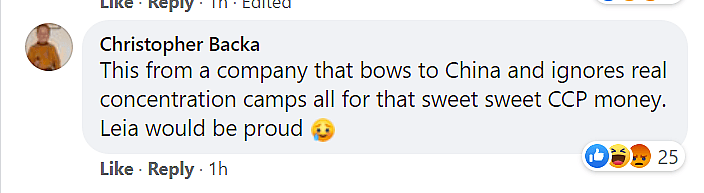 “This from a company that bows to China and ignores real concentration camps all for that sweet sweet CCP money. Leia would be proud,” wrote Christopher Backa.