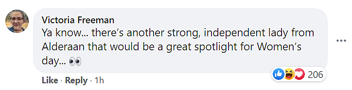Victoria Freeman responded to the post writing, “Ya know… there’s another strong, independent lady from Alderaan that would be a great spotlight for Women’s day…”