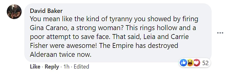David Baker stated, “You mean like the kind of tyranny you showed by firing Gina Carano, a strong woman? This rings hollow and a poor attempt to save face. That said, Leia and Carrie Fisher were awesome! The Empire has destroyed Alderaan twice now.”