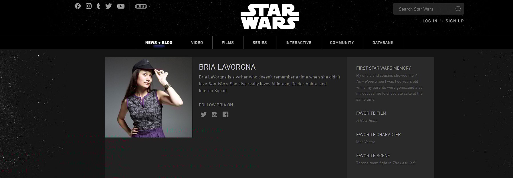 LaVorgna has written numerous articles for StarWars.com with her most recent being published in September 2020 titled ‘Empire at 40 | The Evolution Of Costumes In Star Wars: The Empire Strikes Back.”