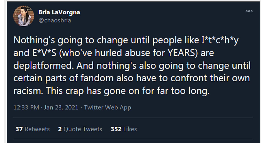 LaVorgna’s view that Star Wars fans are racist and that both Ethan Van Sciver and Itchy Bacca need to be deplatformed was also echoed by her fellow Star Wars writer Bryan Young.