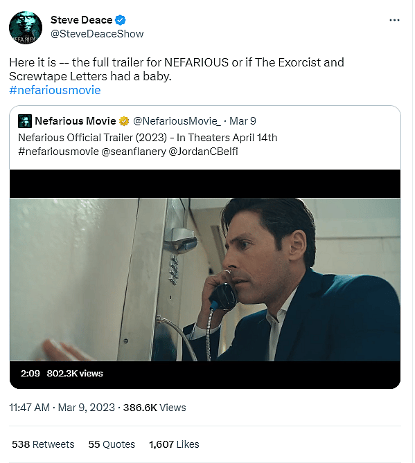 He wrote, “Here it is — the full trailer for NEFARIOUS or if The Exorcist and Screwtape Letters had a baby.”