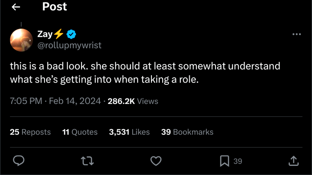 “[This] is a bad look. [She] should at least somewhat understand what she’s getting into when taking a role,” posted another user going by Zay.