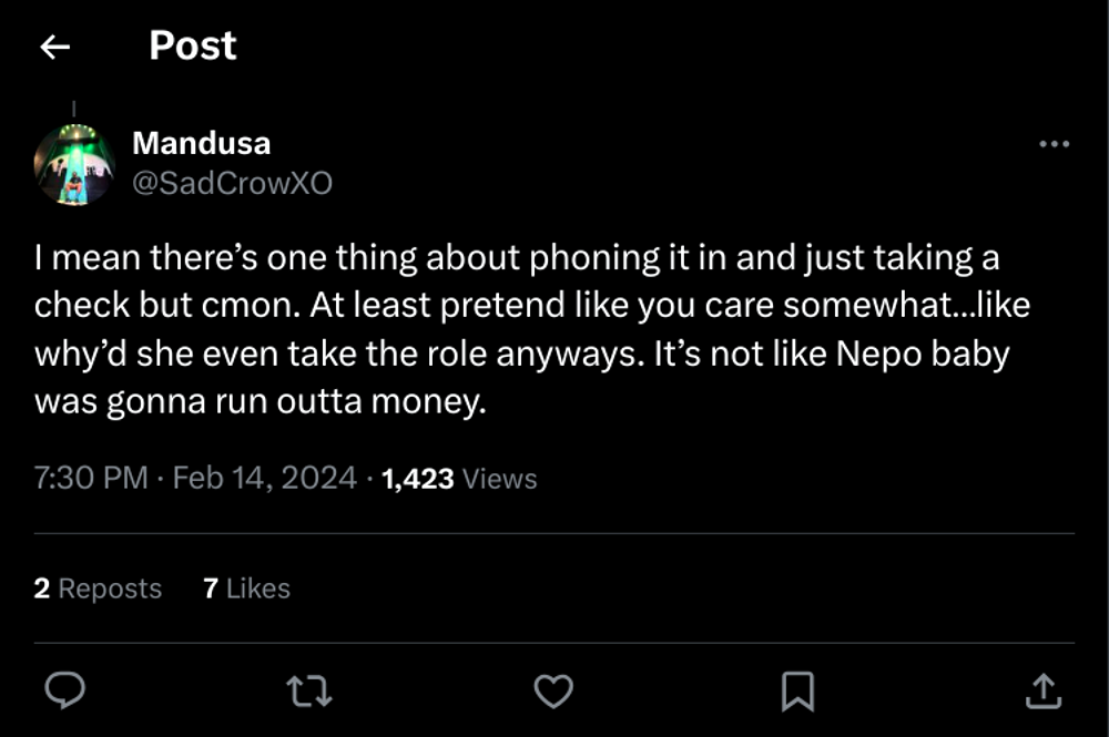 “I mean there’s one thing about phoning it in and just taking a check but cmon. At least pretend like you care somewhat…like why’d she even take the role anyways. It’s not like Nepo baby was gonna run outta money,” wrote Twitter/X user Mandusa.