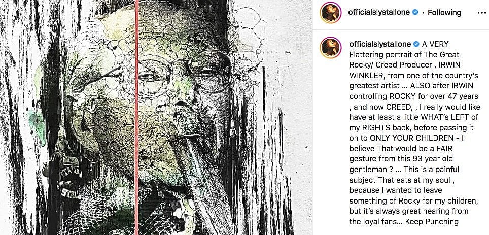 Sharing a “A VERY Flattering portrait of The Great Rocky/Creed Producer, IRWIN WINKLER, from one of the country’s greatest artists,”piece of art depicting Winkler as a snake with a dagger coming out of his mouth to his personal Instagram account on July 18th, Stallone asserted, “ALSO, after IRWIN controlling ROCKY for over 47 years, and now CREED, I really would like [to] have at least a little [of] WHAT’S LEFT of my RIGHTS back, before passing it on to ONLY YOUR CHILDREN”.
