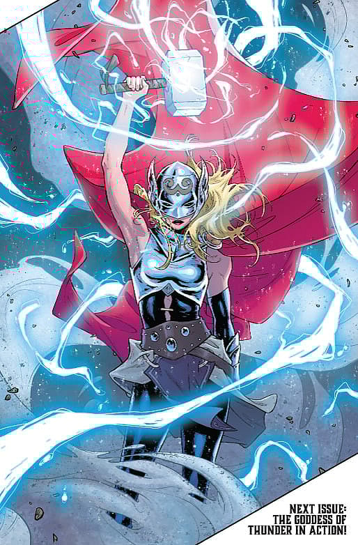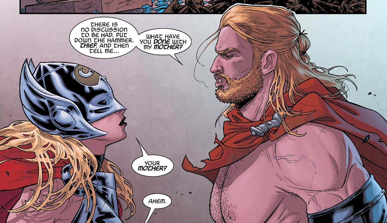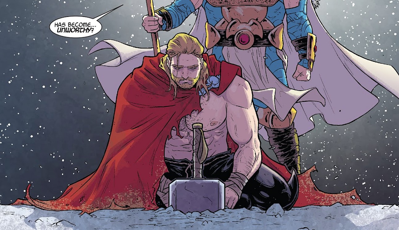 In Aaron’s comic run, Foster does indeed replace Thor as he’s found unworthy to wield Mjolnir. Not only is Thor unworthy to wield Mjolnir, but so is Odin.