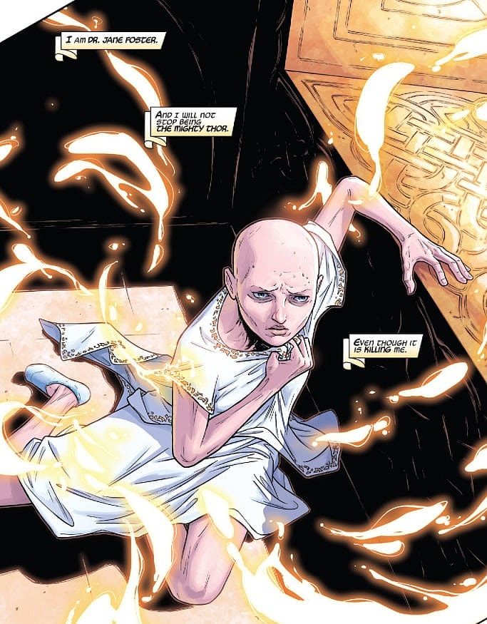 It also saw Foster suffer from cancer albeit while she wields Mjolnir the disease is kept at bay. However, when she is separated from the hammer’s magic the disease continues to eat away at her own body.