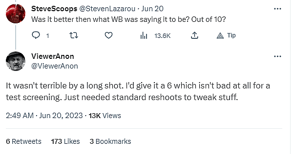 “It wasn’t terrible by a long shot,” he tweeted. “I’d give it a 6 which isn’t bad at all for a test screening. Just needed standard reshoots to tweak stuff.”