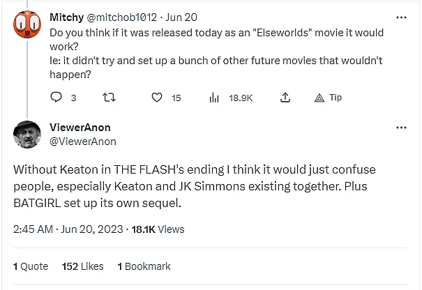 With Keaton returning to run point and coaching the novice hero Barbara, Batgirl had to connect to The Flash and, what’s more, come out after to fit into the revised continuity. However, ViewerAnon does not remember seeing any references to the Speedster’s floundering FX-soaked adventure. “Not that I remember but it’s been awhile,” he said.