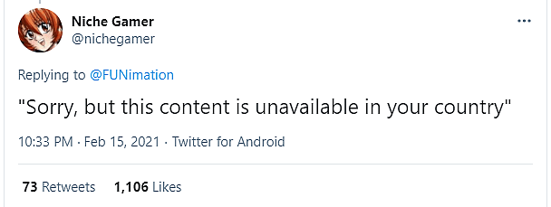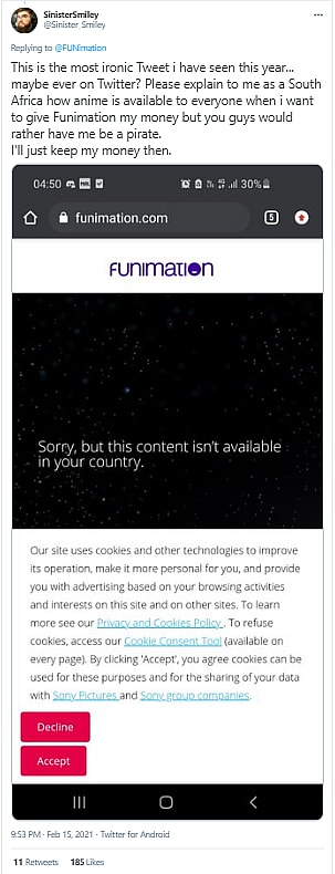Sinister_Smiley actually shared a screenshot from Funimation with the message “Sorry, but this content isn’t available in your country.”