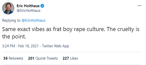 In a subsequent tweet, he added, “Same exact vibes as frat boy rape culture. The cruelty is the point.”